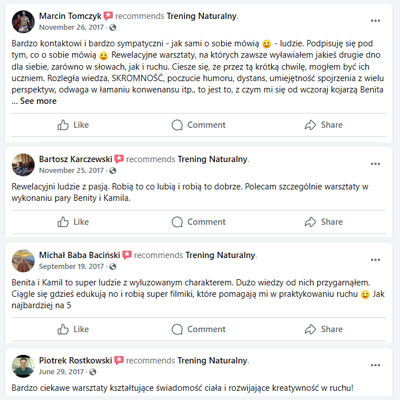 Przeprowadziliśmy wiele treningów personalnych i warsztatów przez ponad 15 lat. Tak więc bazując na naszym doświadczeniu śmiało możemy powiedzieć, że wiemy jaki ruch i ćwiczenia są dobre dla Twojego ciała.
